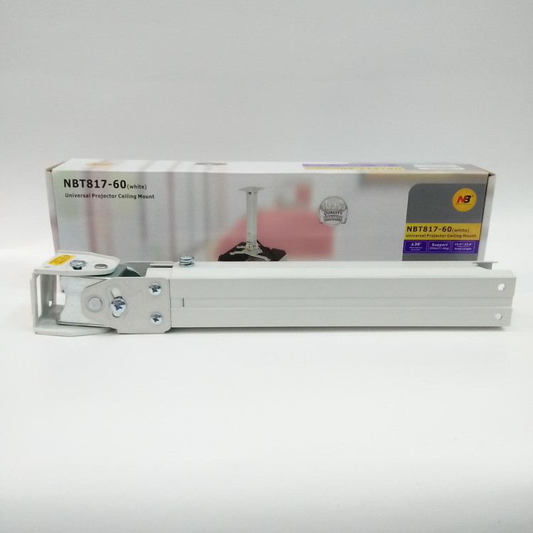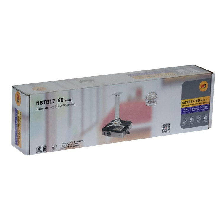 پایه سقفی - دیواری ویدئو پروژکتور NBT817-60 با ظاهری شکیل برای نصب ویدئو پروژکتور به سقف یا دیوار مورد استفاده قرار میگیرد. کاربران میتوانند با توجه به مدل ویدئو پروژکتور ( لنز معملی یا لنز فاصله کوتاه)، پایه NBT817-60 به سقف یا دیوار نصب نمایند. این پایهها دارای دو پروفیل هستند که بهصورت کشویی درون هم میلغزند و امکان تنظیم دقیق ارتفاع را بین دو حالت حداقل 39 و حداکثر 60 سانتی متر از سقف یا دیوار فراهم میکنند.امکان عبور دادن کابل HDMI، کابل VGA و کابل برق از داخل پروفیل ( برخلاف پایه سقفی اسکوپ) جهت حفظ زیبایی محیط وجود دارد.قابلیت چرخش 360 درجه از دیگر مزیای پایه NBT817-60 می باشد.قابلیت تحمل وزن تا 12 کیلوگرم و ایده آل برای دستگاه های حرفه ایی می باشد.امکان جدا کردن ویدئو پروژکتور از پایه NBT817-60 با استفاده از ضامن ساده در زمان کمتر از 2 ثانیه موجب سهولت در جابجایی پروژکتور هنگام سفر می باشد.به جز دیتا پروژکتورهای پرتابل یا اصطلاحا مینی پروژکتورها که صرفا برای مصارف قابلحمل طراحی شدهاند، اکثر ویدئو پروژکتورهای موجود در بازار امکان نصب به سقف و دیوار را دارند. برای حصول اطمینان کافی است در زیر دستگاه خود، جای سه الی چهار پیچ را ملاحظه نمایید.