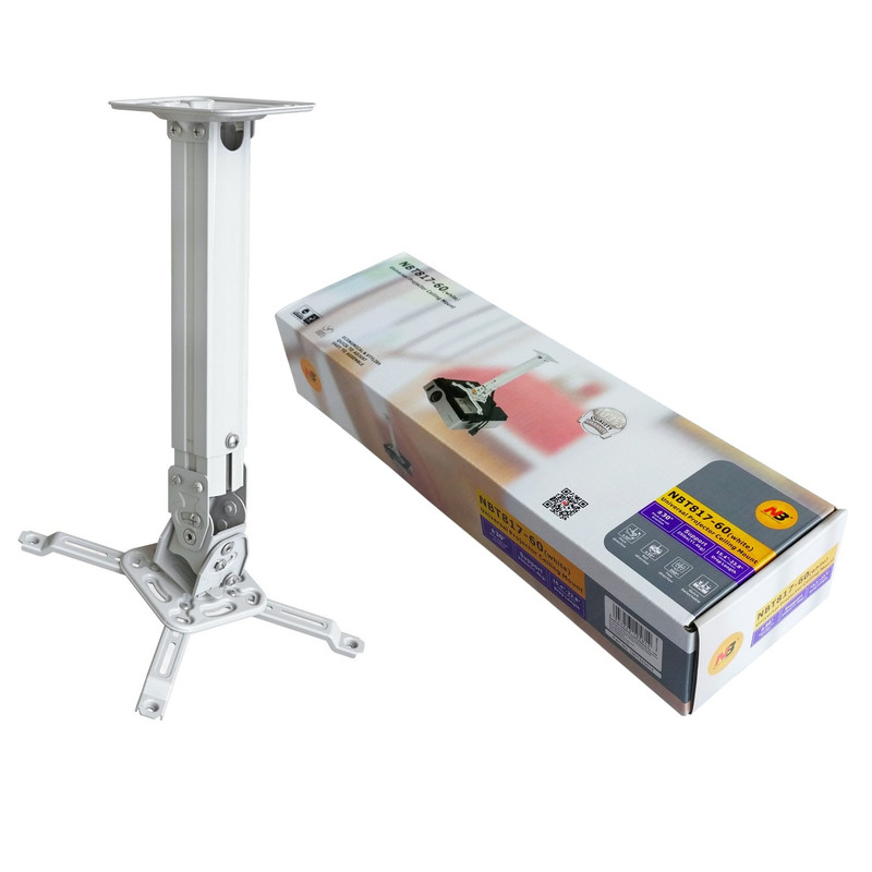 پایه سقفی - دیواری ویدئو پروژکتور NBT817-60 با ظاهری شکیل برای نصب ویدئو پروژکتور به سقف یا دیوار مورد استفاده قرار میگیرد. کاربران میتوانند با توجه به مدل ویدئو پروژکتور ( لنز معملی یا لنز فاصله کوتاه)، پایه NBT817-60 به سقف یا دیوار نصب نمایند. این پایهها دارای دو پروفیل هستند که بهصورت کشویی درون هم میلغزند و امکان تنظیم دقیق ارتفاع را بین دو حالت حداقل 39 و حداکثر 60 سانتی متر از سقف یا دیوار فراهم میکنند.امکان عبور دادن کابل HDMI، کابل VGA و کابل برق از داخل پروفیل ( برخلاف پایه سقفی اسکوپ) جهت حفظ زیبایی محیط وجود دارد.قابلیت چرخش 360 درجه از دیگر مزیای پایه NBT817-60 می باشد.قابلیت تحمل وزن تا 12 کیلوگرم و ایده آل برای دستگاه های حرفه ایی می باشد.امکان جدا کردن ویدئو پروژکتور از پایه NBT817-60 با استفاده از ضامن ساده در زمان کمتر از 2 ثانیه موجب سهولت در جابجایی پروژکتور هنگام سفر می باشد.به جز دیتا پروژکتورهای پرتابل یا اصطلاحا مینی پروژکتورها که صرفا برای مصارف قابلحمل طراحی شدهاند، اکثر ویدئو پروژکتورهای موجود در بازار امکان نصب به سقف و دیوار را دارند. برای حصول اطمینان کافی است در زیر دستگاه خود، جای سه الی چهار پیچ را ملاحظه نمایید.