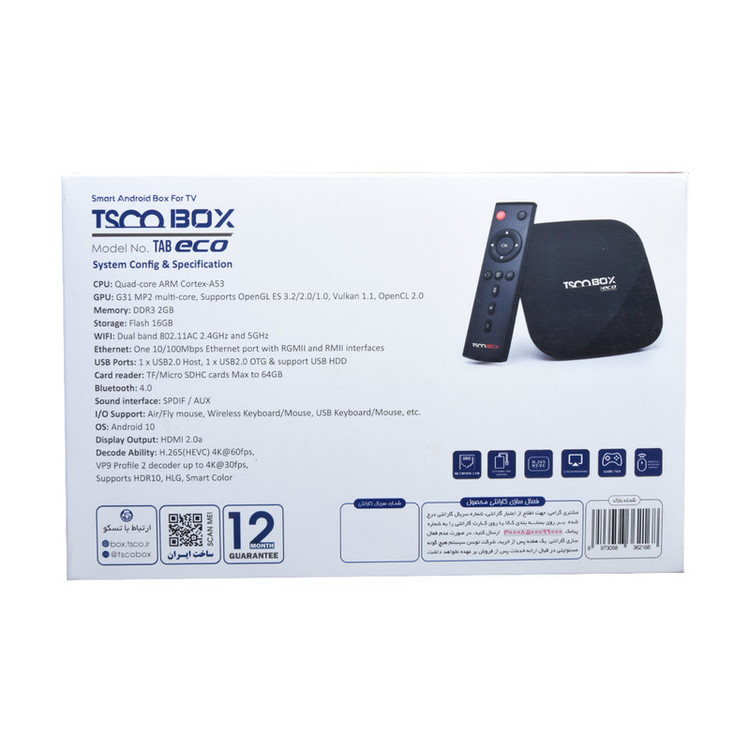 اندروید باکس تسکو مدل TAB ECO میتواند تلویزیونهای معمولی را به یک دستگاه هوشمند تبدیل کند. این محصول از سیستم عامل اندروید 10 برخوردار است و می¬توانید انواع نرم افزارها و بازیهای اندرویدی را بر روی آن نصب کرده و به دنیای گستردهای از امکانات در این اندروید باکس دسترسی داشته باشید. یکی از جذابترین بخشهای تیوی باکس تسکو مدل اکو، برخورداری از سیستم عامل اندروید 10 است که امکان نصب بروزترین نرم افزارها و بازیهای اندرویدی را برای کاربران فراهم میسازد. این دستگاه به صورت کامل در ایران ساخته شده است و همین موضوع نیز سبب شده تا قیمت مقرون به صرفهتری نسبت به محصولات مشابه داشته باشد. 2 گیگ حافظه Ram برای این اندروید باکس در نظر گرفته شده است که در کنار یک چیپ AllWinner H313 و پردازنده اصلی 4 هستهای، بخش اصلی سخت افزار تی وی باکس را تشکیل میدهند. این سخت افزار کمک میکند تا بتوانید به راحتی ویدئوهای 4K/60 را با فرمتهای مختلف از جمله H.265 روی دستگاه اجرا کنید و همچنین پشتیبانی از HDR نیز جزو ویژگیهای این تیوی باکس است. این محصول با عرضه تمام قابلیتهای یک مینی کامپیوتر خانگی از قبیل انجام بازی، وبگردی در اینترنت، نمایش فیلم، بسترهای پخش آنلاین موسیقی، استفاده از اپلیکیشنهای شبکههای اجتماعی، سرویسهای دیگر، حداکثر سهولت و کارایی را در اختیار عموم کاربران اعم از خانگی و اداری قرار خواهد داد.